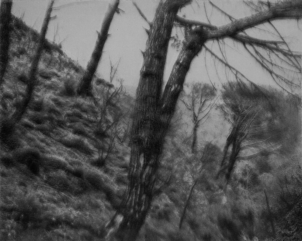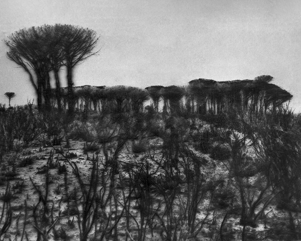 These prints embody charred landscapes and trees, their charred surfaces, misty skies with no horizon, but also the trembling of renewal. The three-dimensional, almost bas-relief-like surface conveys a vibration, the real or imagined vibration of destroyed forests as they begin to rise from the ashes.