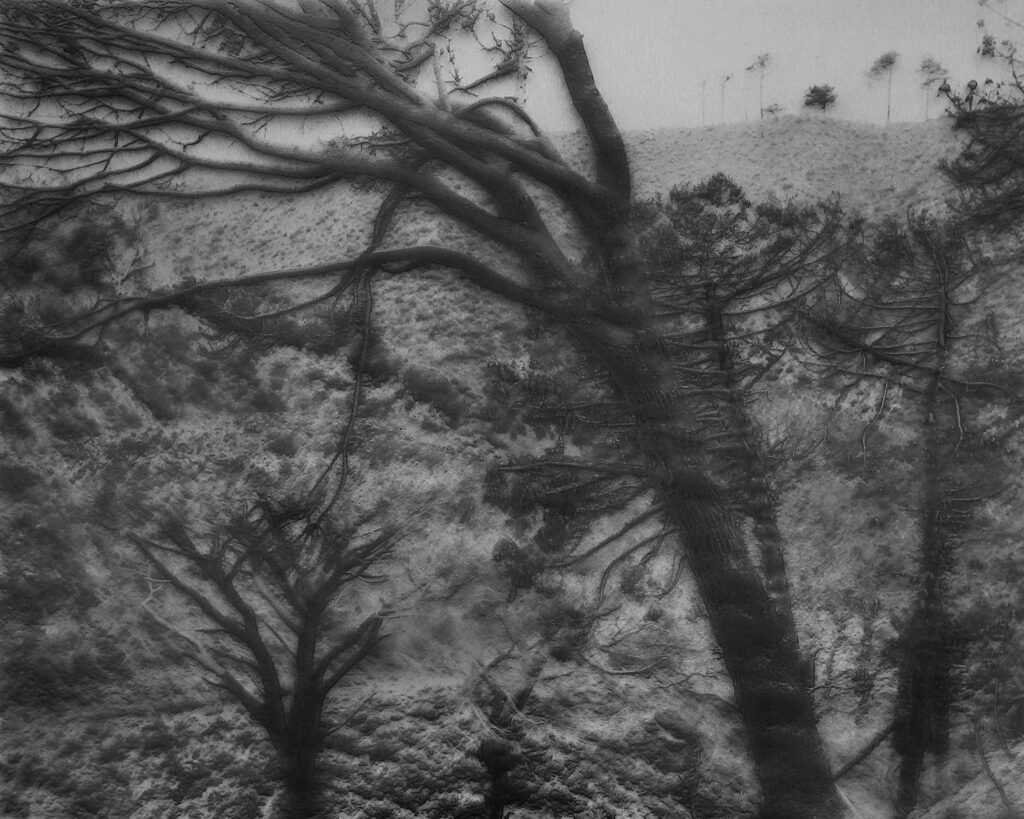 Taken in black and white with a view camera, the images show the remains of the Sicilian forest after the great fires of summer 2023. The prints were made using a chemical-free laser engraving technique on recycled cardboard. The slow progression of the laser burn on the support during 24 hours acts like fire as it consumes nature.