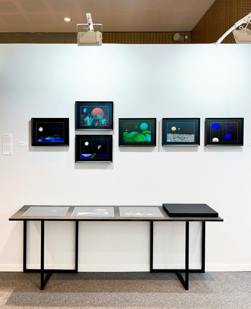 Dans l’exploration des frontières du medium photographique, la Galerie Binome établit là des dialogues avec le dessin. Les Vues d’artiste du cosmos, photogrammes de dessin sur calque de Baptiste Rabichon et Suaire (saint ?), dessins sur photographies d’AurelK, jouent de cette association des médiums en brouillant les pistes entre esquisses et impressions. Quand les dessins Rêves de Corinne Mercadier percent la surface d’un fond d’or telle l’apparition d’une image latente et s’éclairent d’une lumière toute photographique. La part du noir, celle de l’ombre, de la nuit et de l’infini qui traverse leurs œuvres construit des espaces de révélation.