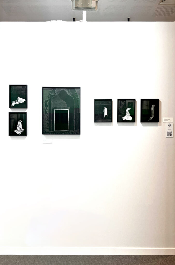 In exploring the boundaries of the photographic medium, Galerie Binome establishes dialogues with drawing. Baptiste Rabichon’s Vues d’artiste of the cosmos, photograms of drawings on tracing paper, and AurelK’s Suaire (saint?), drawings on photographs, play on this association of mediums, blurring the lines between sketches and impressions. When Corinne Mercadier’s Rêves drawings pierce the surface of a golden background like the appearance of a latent image, they are illuminated by an entirely photographic light. The share of black, shadow, night and infinity that runs through their work creates spaces of revelation.