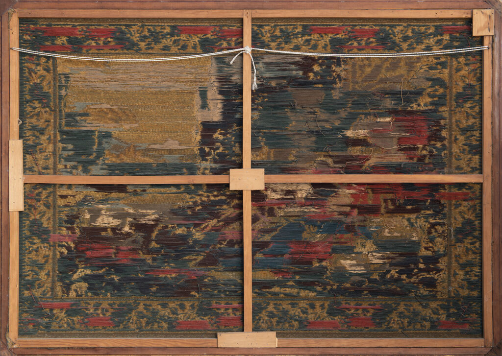 Réalisées selon la technique complexe du Jacquard, les tapisseries mêlent des fils métalliques d’argent et d’or rose qui créent de subtils dégradés et les auréolent d’une lumière spectrale. Ce qu’on ne voit pas en plein jour, c’est que dans l’épaisseur du tissage se cachent des fils phosphorescents. Il suffit de faire le noir complet autour des œuvres pour que se réveillent les images latentes, à savoir les corps luminescents des personnages, doubles fantomatiques qui se maintiennent en suspens jusqu’à leur effacement progressif. Memento mori, ce jeu d’apparition et de disparition relève aussi du régime de l’image.