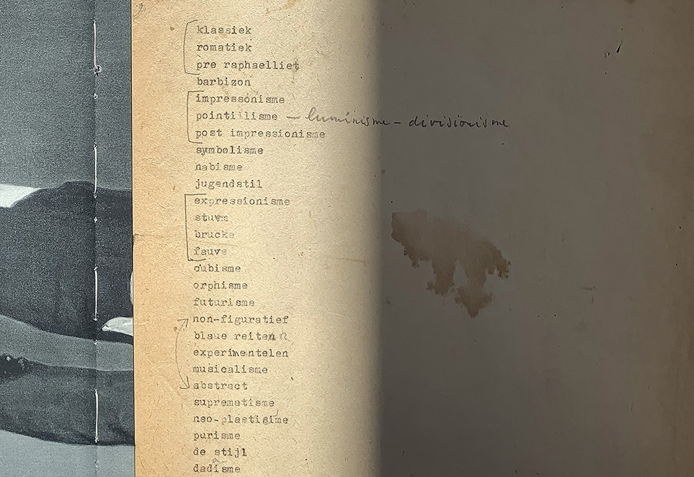 Laurence borrowed Manet. Opening it on her studio table, the book opened to the double page of ‘Le Torero mort’.A typed written lose page was in the back of the book, listing patiently all painting styles of the last 150 years. Like an endlessly turning wheel, inventing itself on an on.