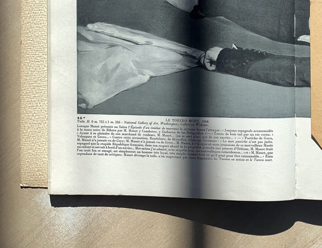 Laurence a emprunté un livre de Manet. En l’ouvrant sur la table de son atelier, le livre s’est ouvert à la double page du « Torero mort ». Une page volante dactylographiée se trouvait à la fin du livre, énumérant patiemment tous les styles de peinture des 150 dernières années. Comme une roue qui tourne sans fin, s’inventant sans cesse. Une tache en forme de monstre fantastique et doux se trouvait dans la marge.