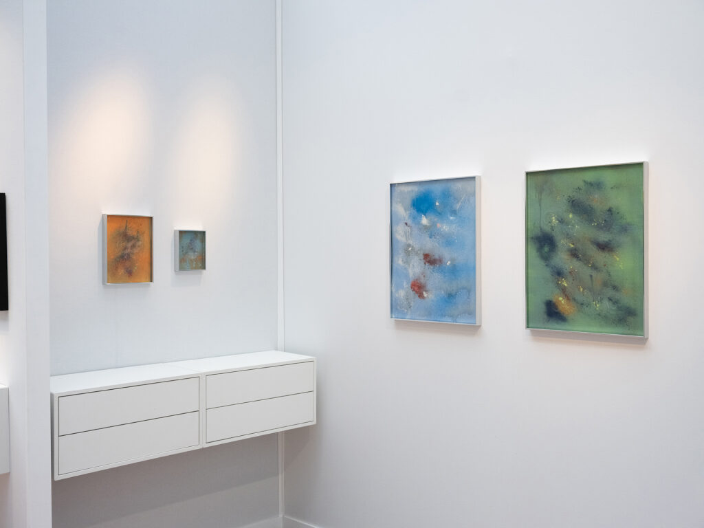 sans appareil photo ni négatifs. L’artiste recouvre le papier aquarelle de pigments fluorescents, puis y projette de l’alun, réactif chimique qui inhibe la photosensibilité propre à la gomme bichromatée, créant sur l’ensemble de la surface picturale un effet nébuleux dont les irrégularités apparaissent comme les purs aléas que connaît la vie de la matière, comme l’état momentané d’un processus entropique en cours. Afin de rendre encore un peu plus instable ces abstractions vaporeuses, l’artiste recouvre le papier d’une épaisse plaque de verre thermoformé, moulée sur l’empreinte d’un souffle dans de la poudre de plâtre. Equivalent_Kosmos incarne l’idéal photographique de l’artiste d’unir l’immatérialité de la lumière et la matérialité de la peinture, en y ajoutant le verre, masse translucide, réfractante et protectrice, qui scelle l’abstraction pigmentée tout en en modulant son apparition.