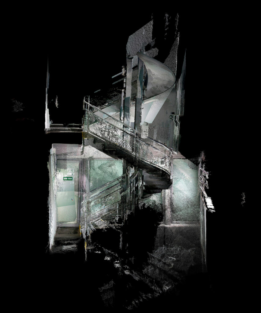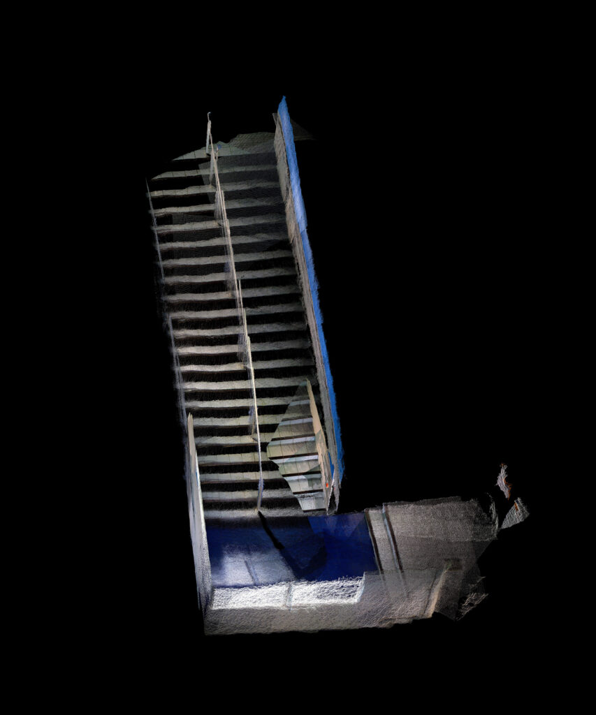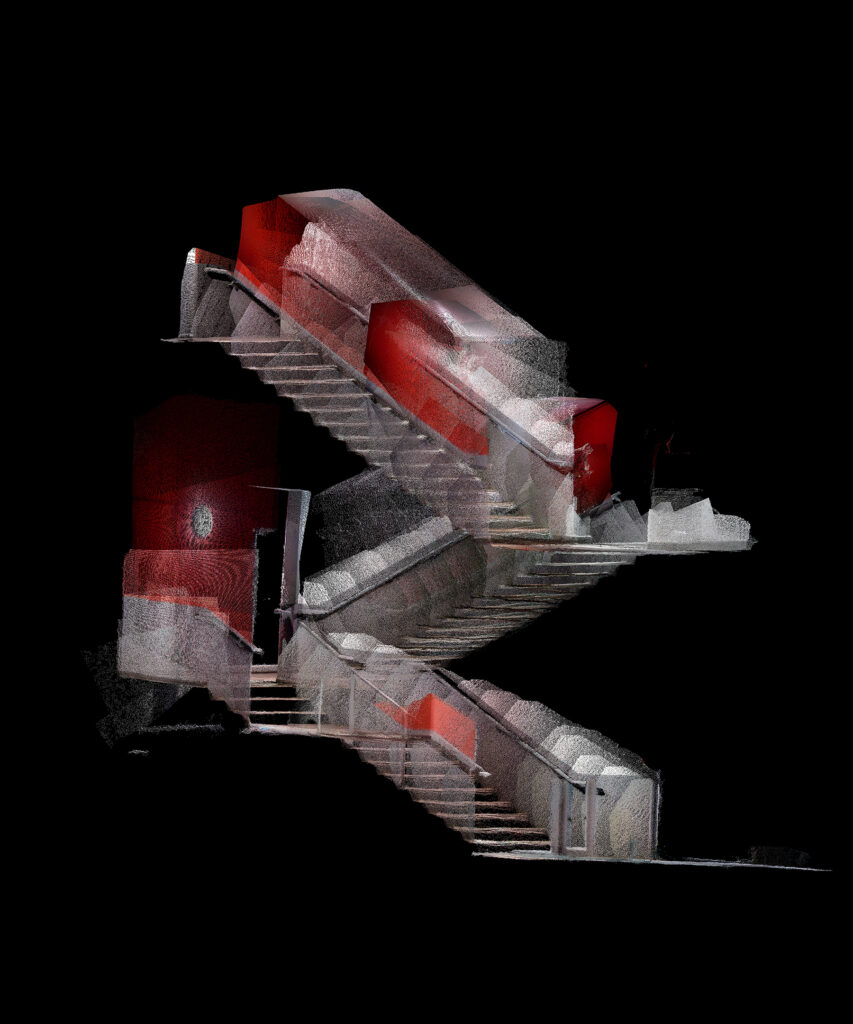Les images intitulées Skin (2020) forment une œuvre contigüe avec les pièces de la série Boîte noire (2019), qu’elles viennent compléter. En langage digital, « Skin » s’entend comme les éléments matriciels qui composent une forme numérique tridimensionnelle. Par un processus de dépliage, Thibault Brunet met à plat les textures des bâtiments qui s’étalent comme les briques en vrac d’une boîte de Lego avant la construction du modèle. Le logiciel opère un classement par taille, des informations les plus denses jusqu’aux pixels les moins renseignés. Visuellement, cet ordonnancement simule une perspective, la vue d’un désert de pierres à l’infini, jusqu’à la limite de perception du regard fixée sur la ligne d’horizon. Cette pure fiction de paysage est d’autant plus troublante lorsqu’on considère la similitude avec les déserts de Syrie, comme celui traversé par la route qui mène de Damas à Palmyre.